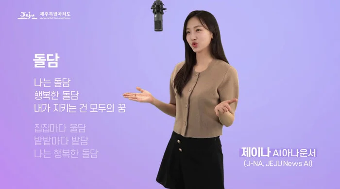 지난 24년 7월 29일 제주도 공식 유튜브 채널인 ‘빛나는 제주TV’를 통해 AI 아나운서 제이나의 뮤직비디오 ‘돌담’이 공개되었습니다. 제주도청과 에이아이파크가 만나 탄생한 ‘제이나’는 올해부터 제주도청의 AI 아나운서로 활동하고 있습니다. ‘위클리 제주’ 콘텐츠를 진행하는 것뿐만 아니라 제주도민체전, 제주포럼 등 다양한 행사에서 진행자로 활약하는 것을 보여드렸는데요. 관련 콘텐츠가 궁금하신 분들은 오른쪽 텍스트를 클릭해 주세요! 제주도청ver. AI 아나운서 ‘제이나’
