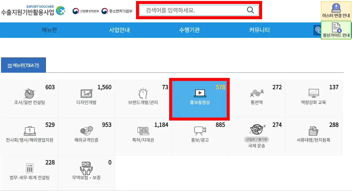 먼저, 위에서 살펴본 바우처 홈페이지에 접속하여 메뉴판을 클릭합니다. 수출바우처 수행 기관으로 선정된 다양한 산업 분야가 보이면 그중에서 홍보 동영상 메뉴를 클릭해요. 대략 500여개가 넘는 서비스가 있어서 시간적 여유가 된다면 하나씩 클릭하여 천천히 알아보는 것을 추천 드리며, 지금은 글로벌 홍보 영상 제작을 위한 AI 아바타 영상 제작이 목적이니 맨 위 검색창에 [AI 아바타]를 검색해 봅시다.