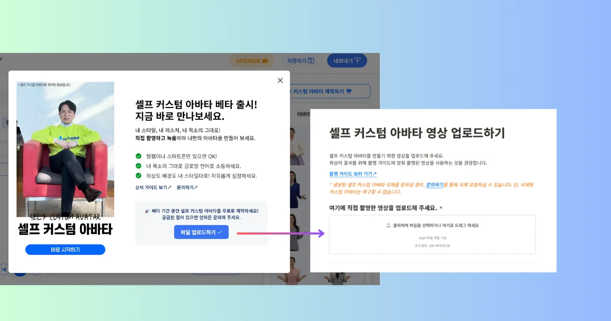 셀프 커스텀 아바타는 사용자가 직접 촬영한 영상과 음성을 업로드해, 자신의 얼굴과 목소리를 그대로 반영한 AI 아바타를 손쉽게 제작할 수 있는 서비스입니다. 기존 AI 아바타 보다 몰입감은 더 높고, 브랜드 정체성은 유지하면서도, 제작 과정은 훨씬 간편해졌어요!