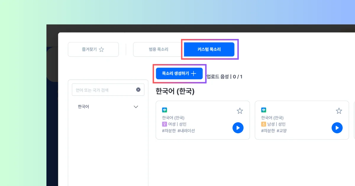 Step4️⃣ 음성 탭 진입 후, 언어 및 목소리 선택하기. 커스텀 목소리 - 목소리 생성하기 클릭하여 업로드 진행하면 나만의 목소리가 생성됩니다.